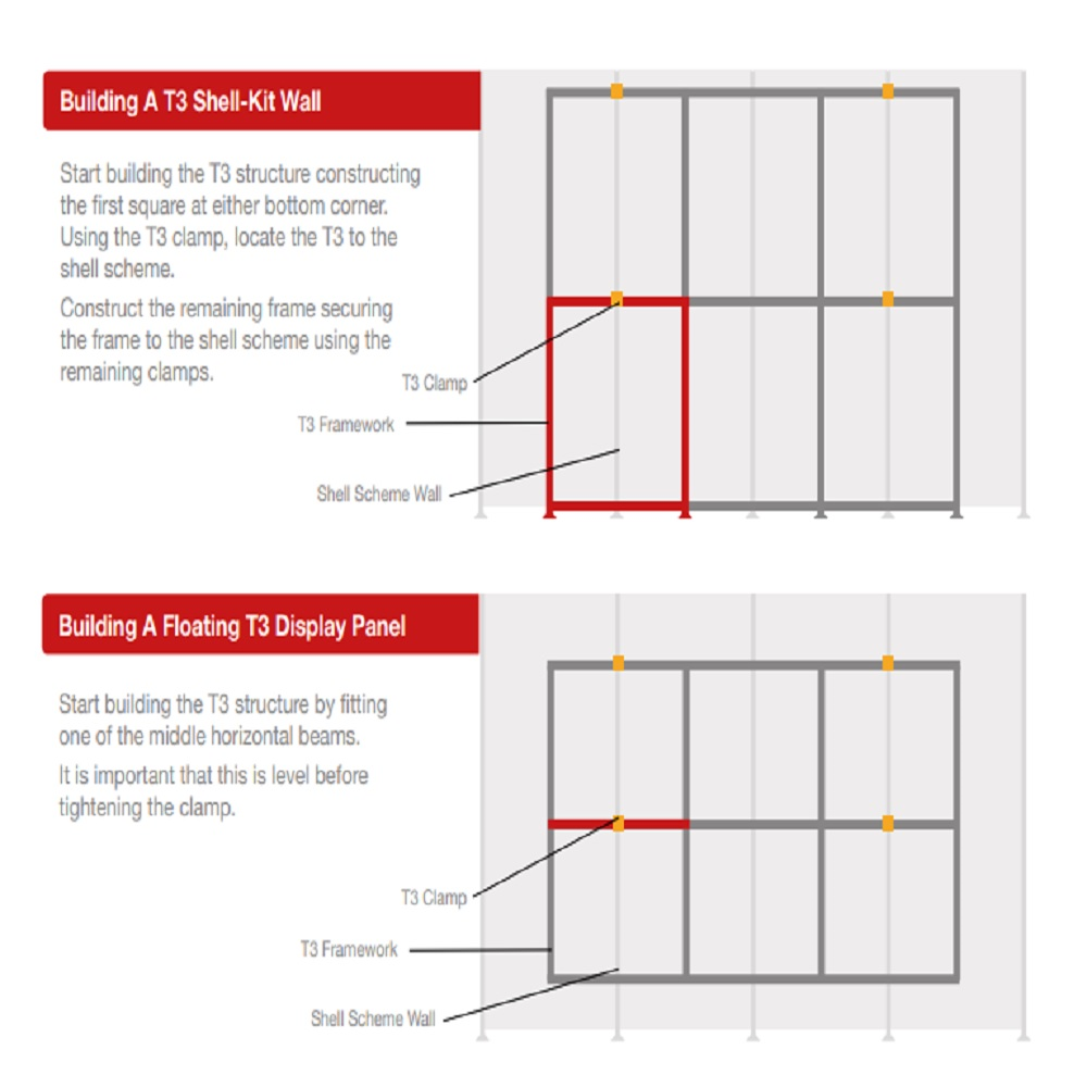 T3 Shell-Kit has been designed with simplicity, adaptability for different venues and maximizing available space. Built around the T3 Shell clamp, which can be fixed to any shell scheme world wide, without any tools, creating seamless fabric display environments.