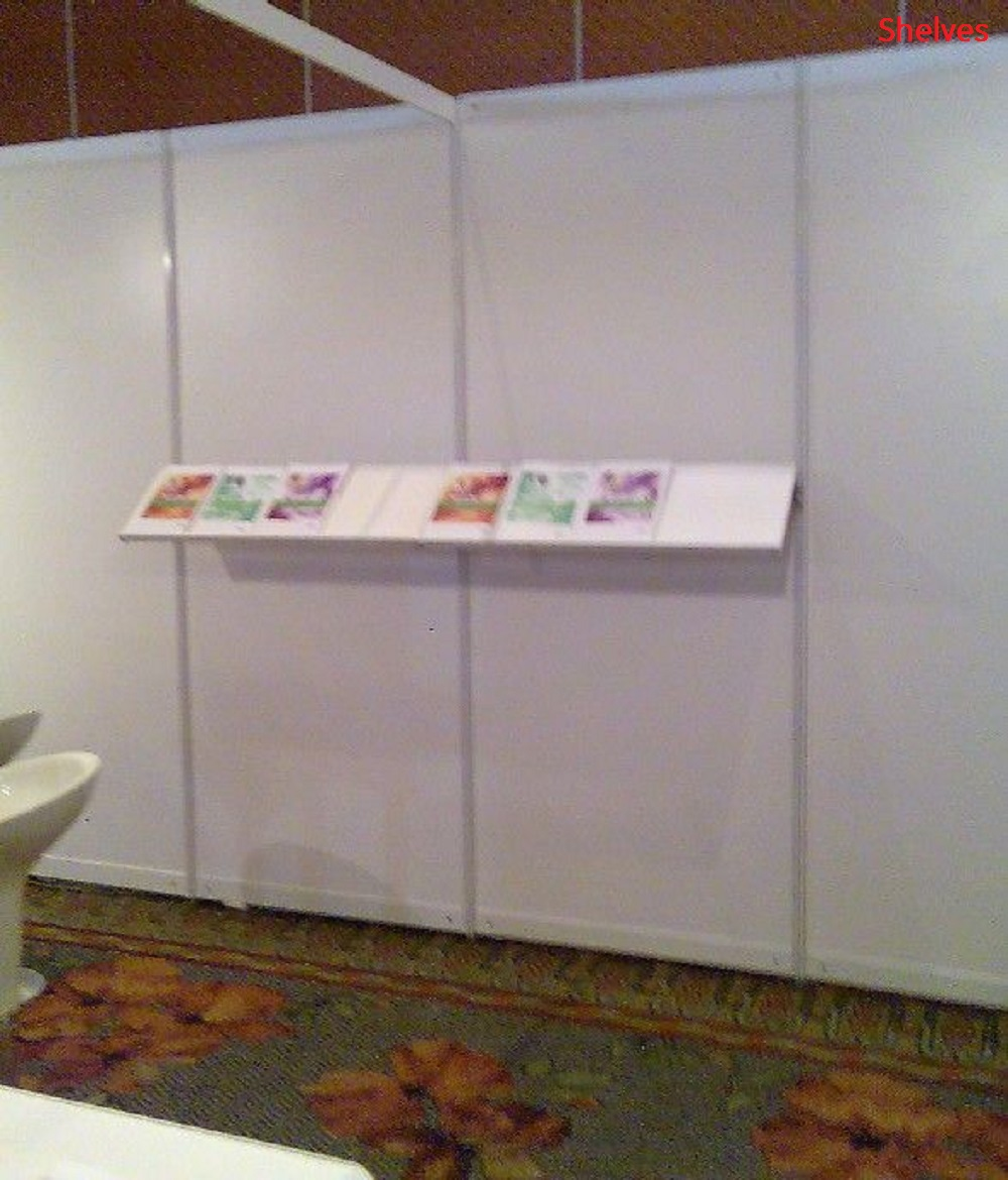 Accessories: aluminium poles and base, table top, slanted shelves, ladder shelves, brochure holder, stabilizing feet and lightning.