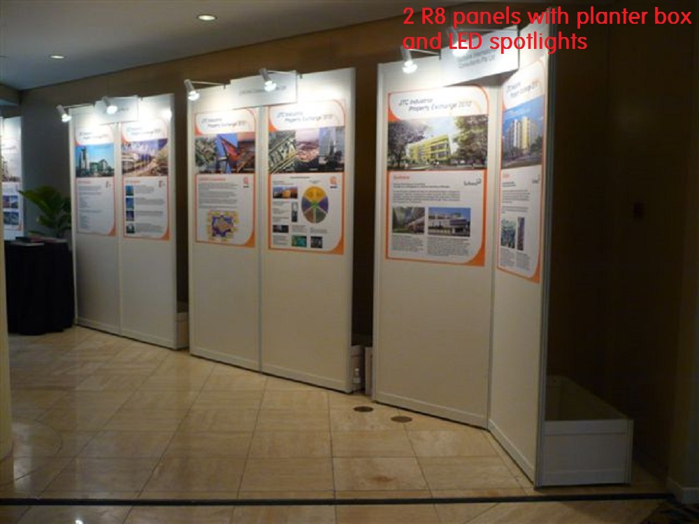 Very popular choice for exhibition and roadshows. Our R8 system panels can formed into meeting rooms, sales booths, storerooms, lightbox towers, entrance arches etc. Call us for more details.